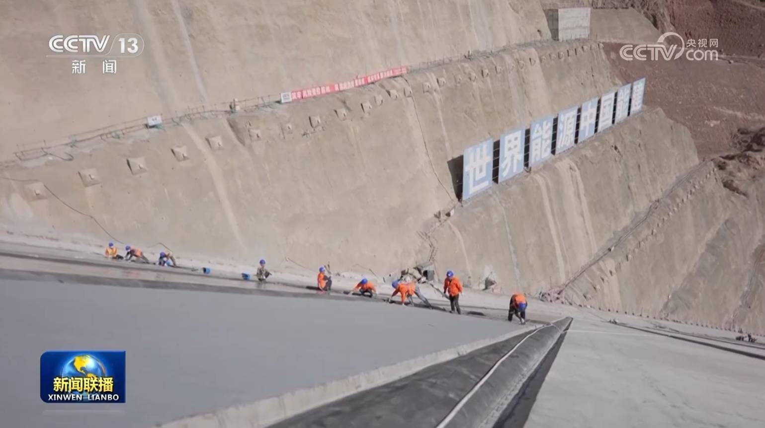 新疆大石峡水利枢纽工程现场,工人们在相当于80层楼高的混凝土石坝上作业。这项民生工程建成后,年生产清洁电能可满足65万户家庭一年的用电需求。