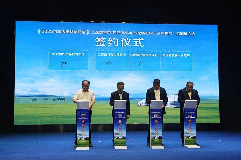 二连浩特市、苏尼特左旗、苏尼特右旗与北京新发地农产品批发市场签署战略合作框架协议。二连浩特市昊罡果蔬粮油进出口园区进出口有限责任公司、内蒙古熊猫羊实业有限公司、北京中农利通供应链管理有限公司等20多家企业进行供需对接签约,现场签定项目协议资金近亿元。
